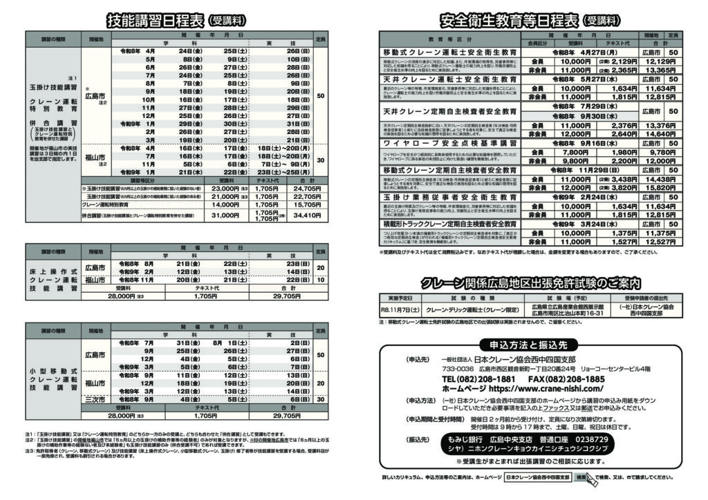 令和8年度 クレーン関係技能講習・安全衛生教育等の日程は下記のとおりです。